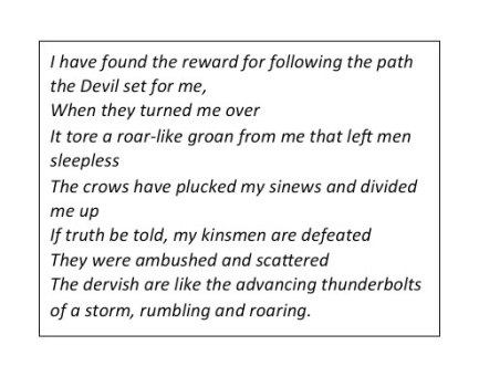 Family connections led Hassan to the story of the legendary Somali leader, national poet and military genius Mohammed 'Abdille Hassan, who fought a religiously inspired guerrilla war against the British colonial army for two decades at the start of the twentieth century. A central and controversial figure in Somali history and culture, he is almost completely unheard of in the west. The title of the play comes from a line in 'Abdille Hassan's most famous poem Koofil.